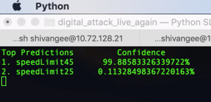 - Physical targeted black-box attack on speed limit 35 sign resulting in a misclassification of the sign to a 45-mph sign